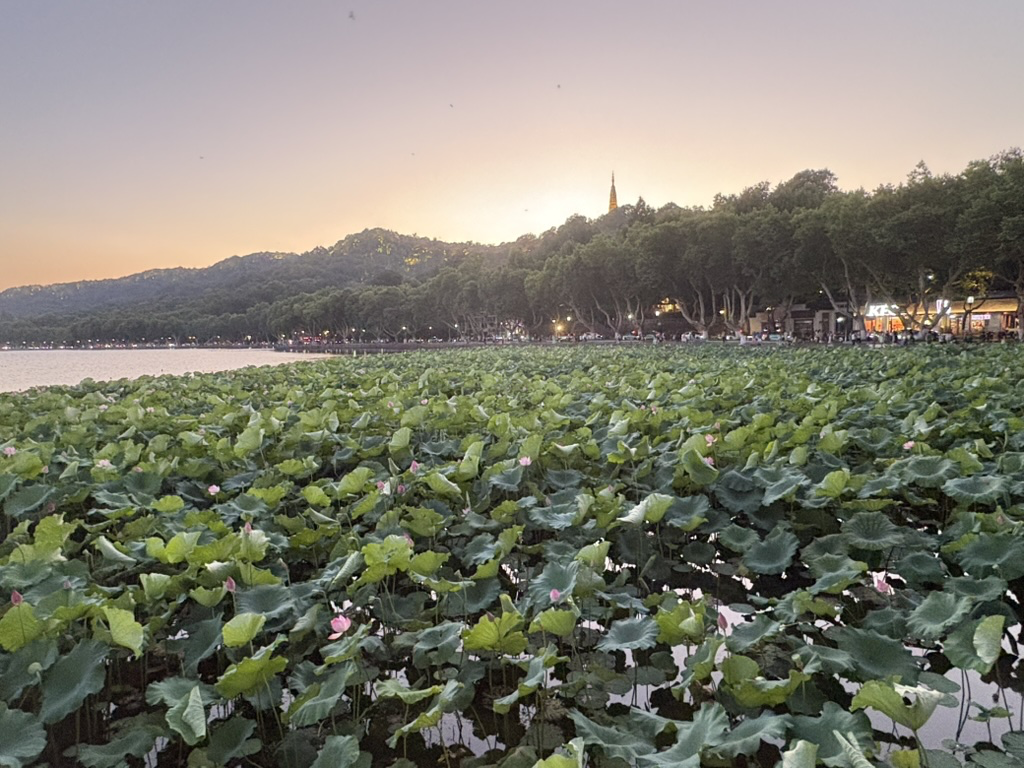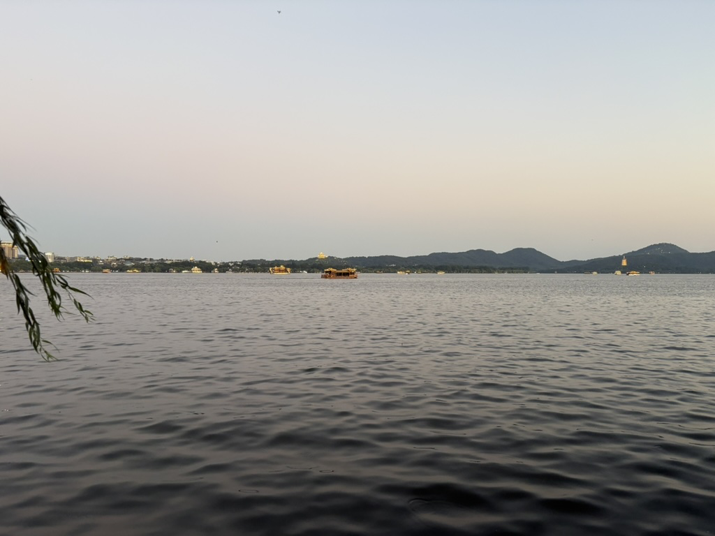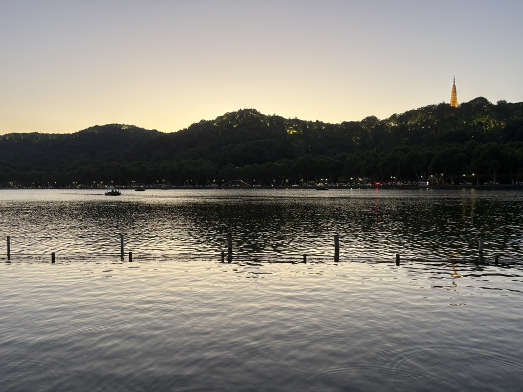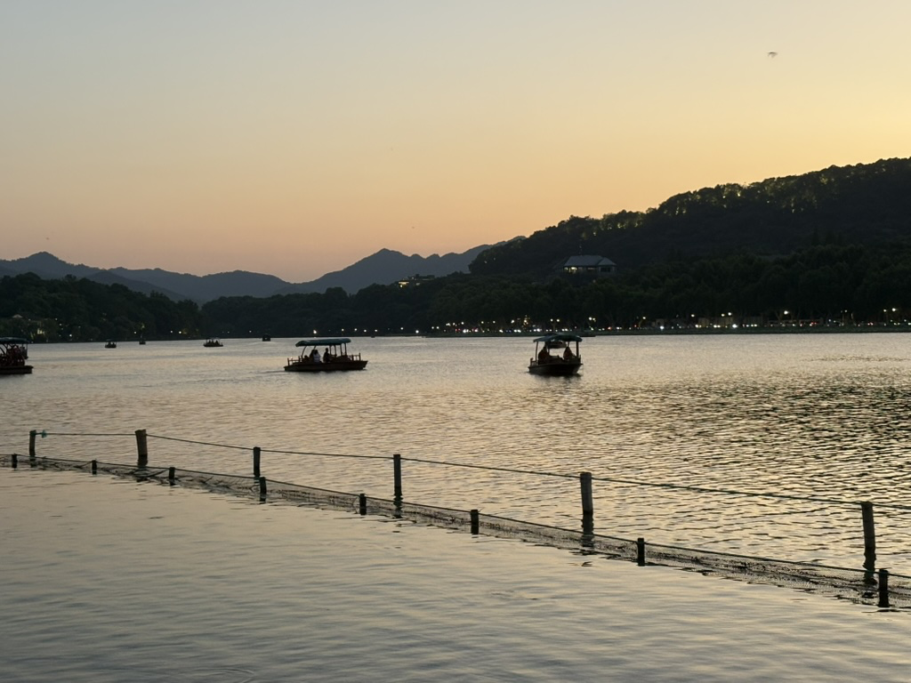 我在 2025年 07 月 03 日晚上又去西湖边骑自行车了,与上次不同的是这次我在白堤上徒步走了一会,然后继续骑自行车回来,我想着能不能让自己通过步行看到一些外国人沟通一下英语,但是这次没有找到机会。